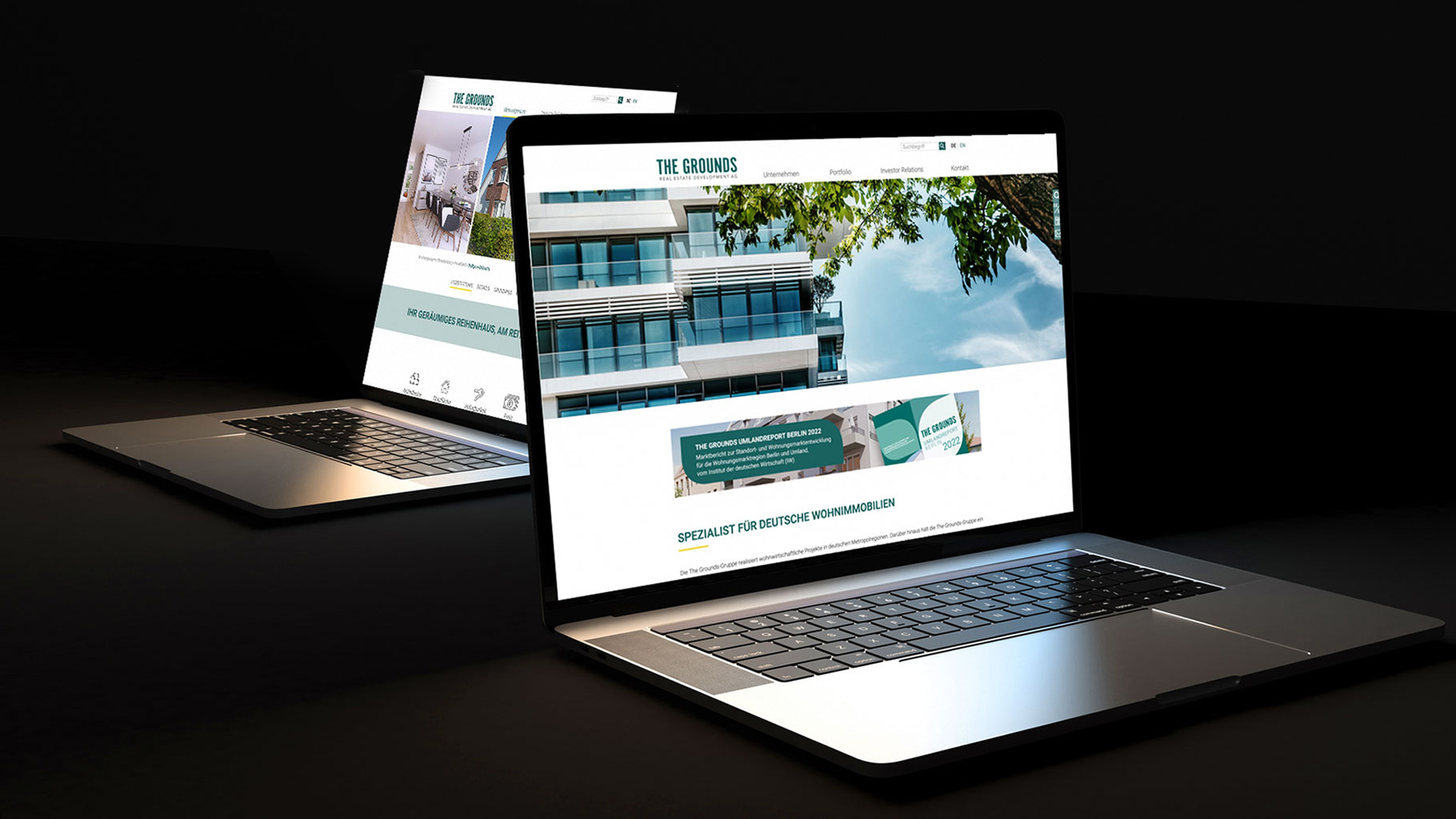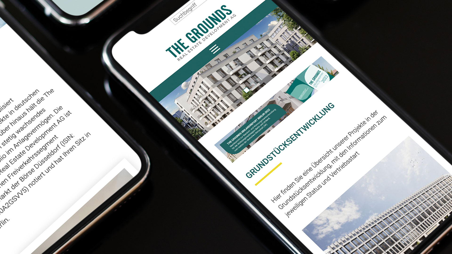 rau kommunikation entwickelt das gesamte Corporate Design inklusive Logo für das Unternehmen. Wir, als Brand- und Webdesign Agentur, betreuen für The Grounds den gesamten Online- und den Print-Bereich gleichermaßen: Wir entwickeln Konzept und Design für die Website und programmieren diese. Dabei setzen wir eine intuitive Navigation und die sichere Anbindung der Datenbank um. Die Seite ist nach neuesten Standards suchmaschinenoptimiert (SEO). Einzelne Bauvorhaben erhalten eigene Landingpages.